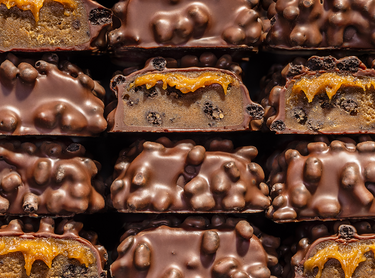 Multi-layered gooey indulgence, a fudgy center with contrasting crunch.